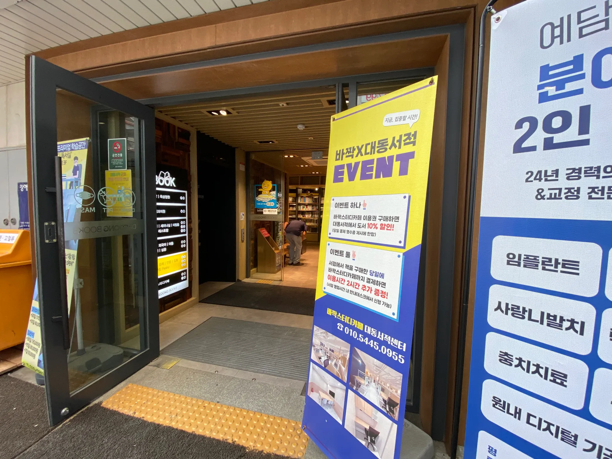 건물 입구는 대동서적 정문과 건물 왼쪽 후문을 이용하실 수 있어요. 정문과 후문 모두 문턱 없이 이용하기 편리합니다.