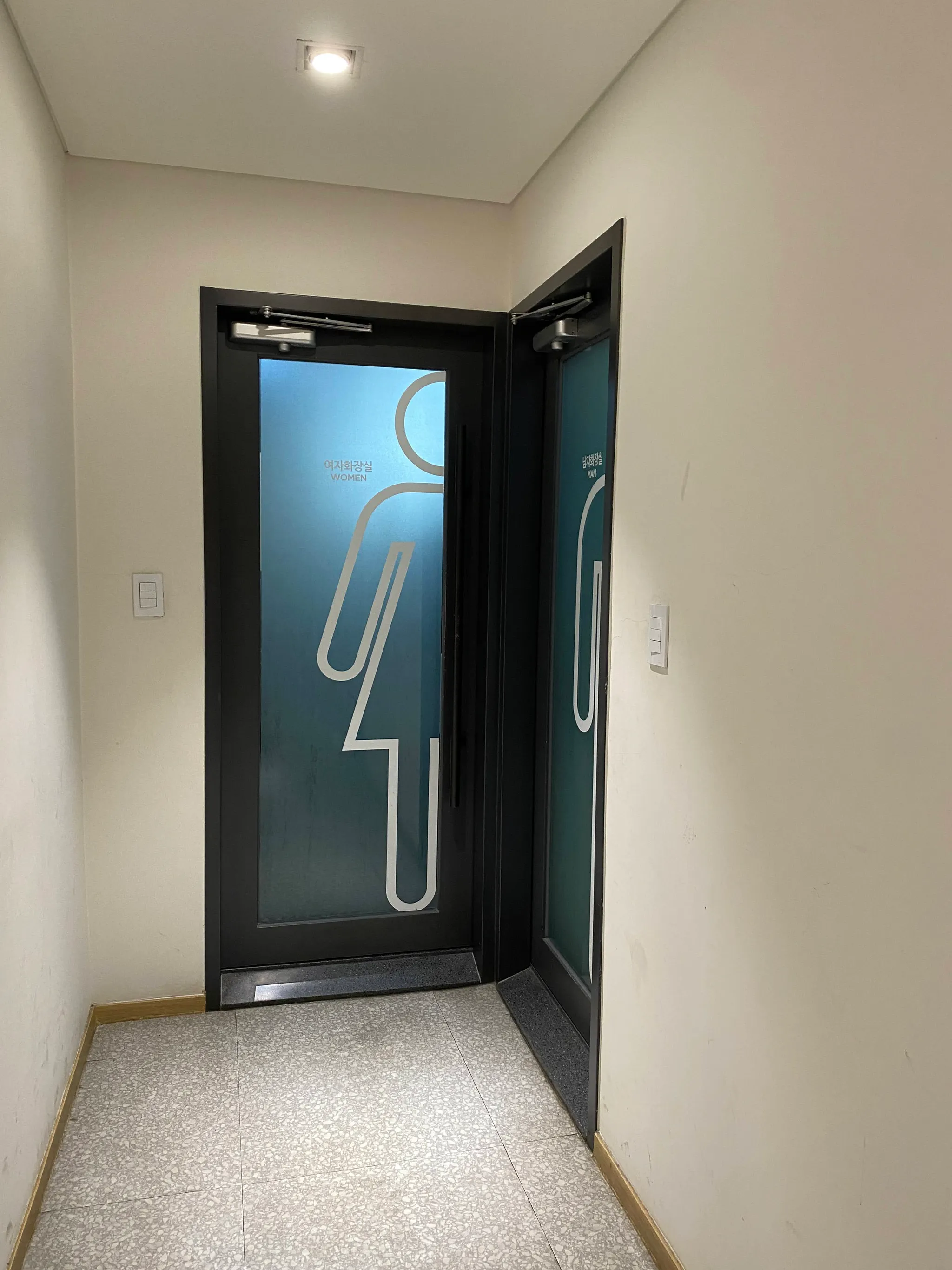 화장실 입구 낮은 턱에 경사가 있습니다. 휠체어 이용하실 수 있지만 입구가 좁으니 도움이 필요하실 수 있습니다.