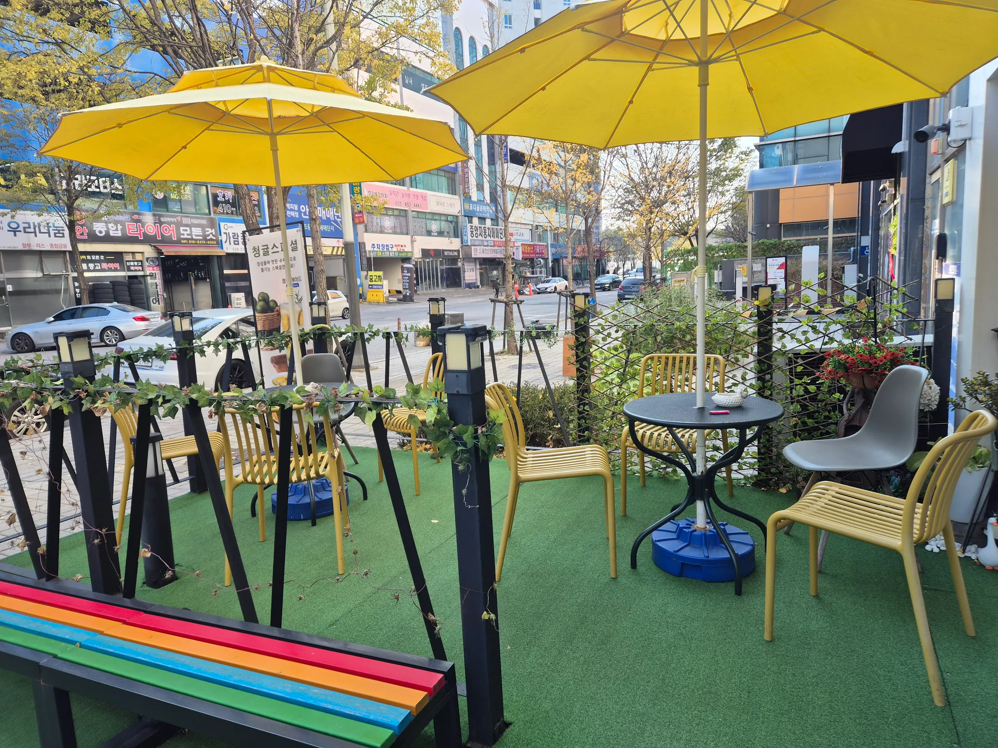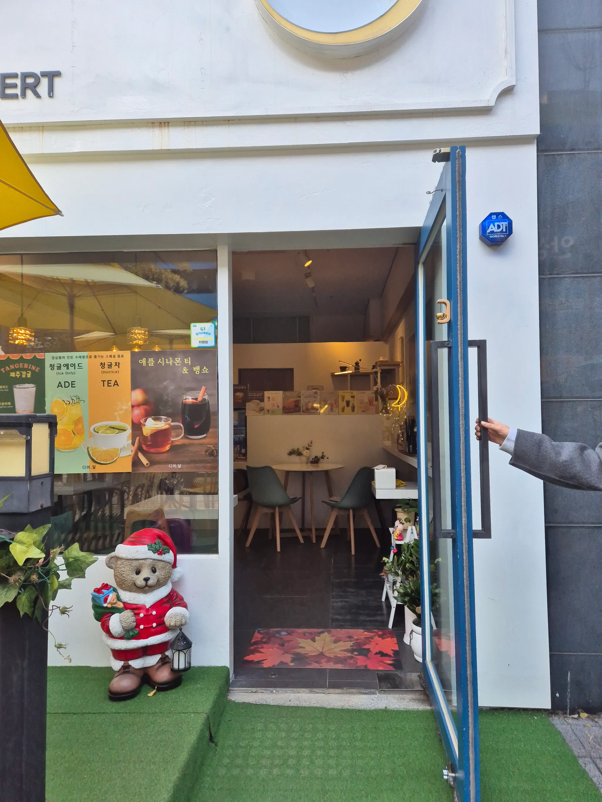 -매장 외부 야외 테라스에는 계단 높이 1개의 턱이 있습니다.