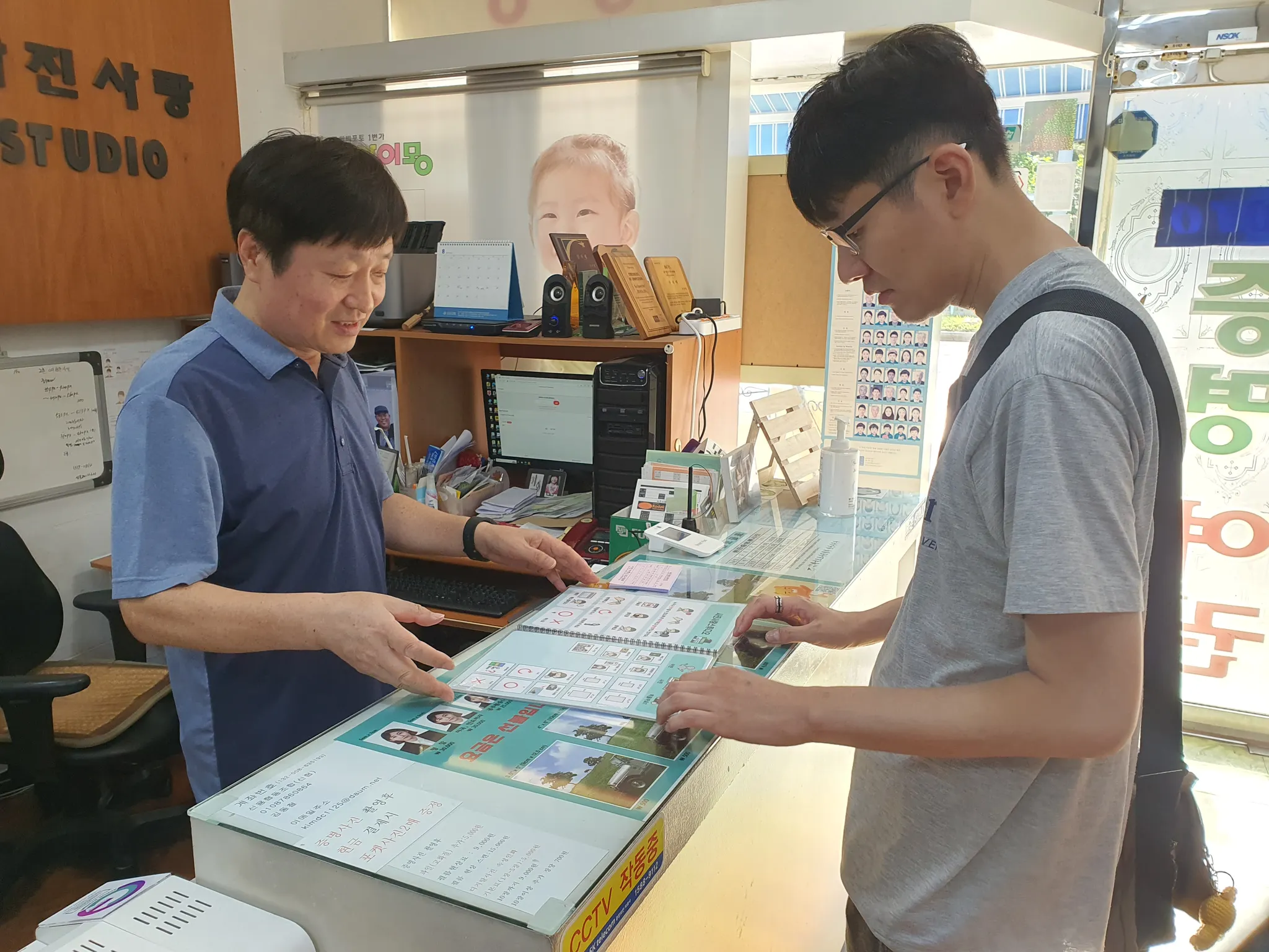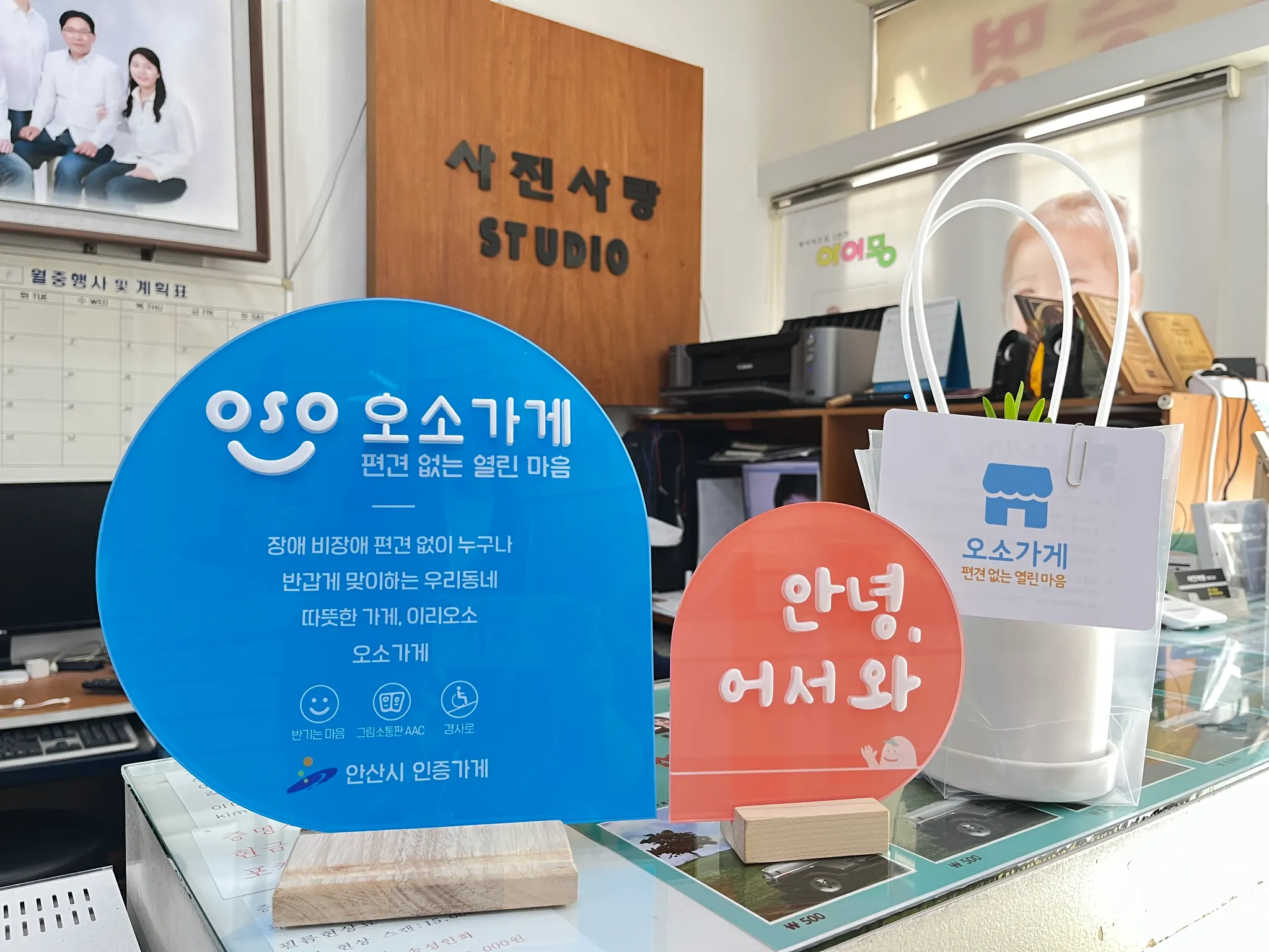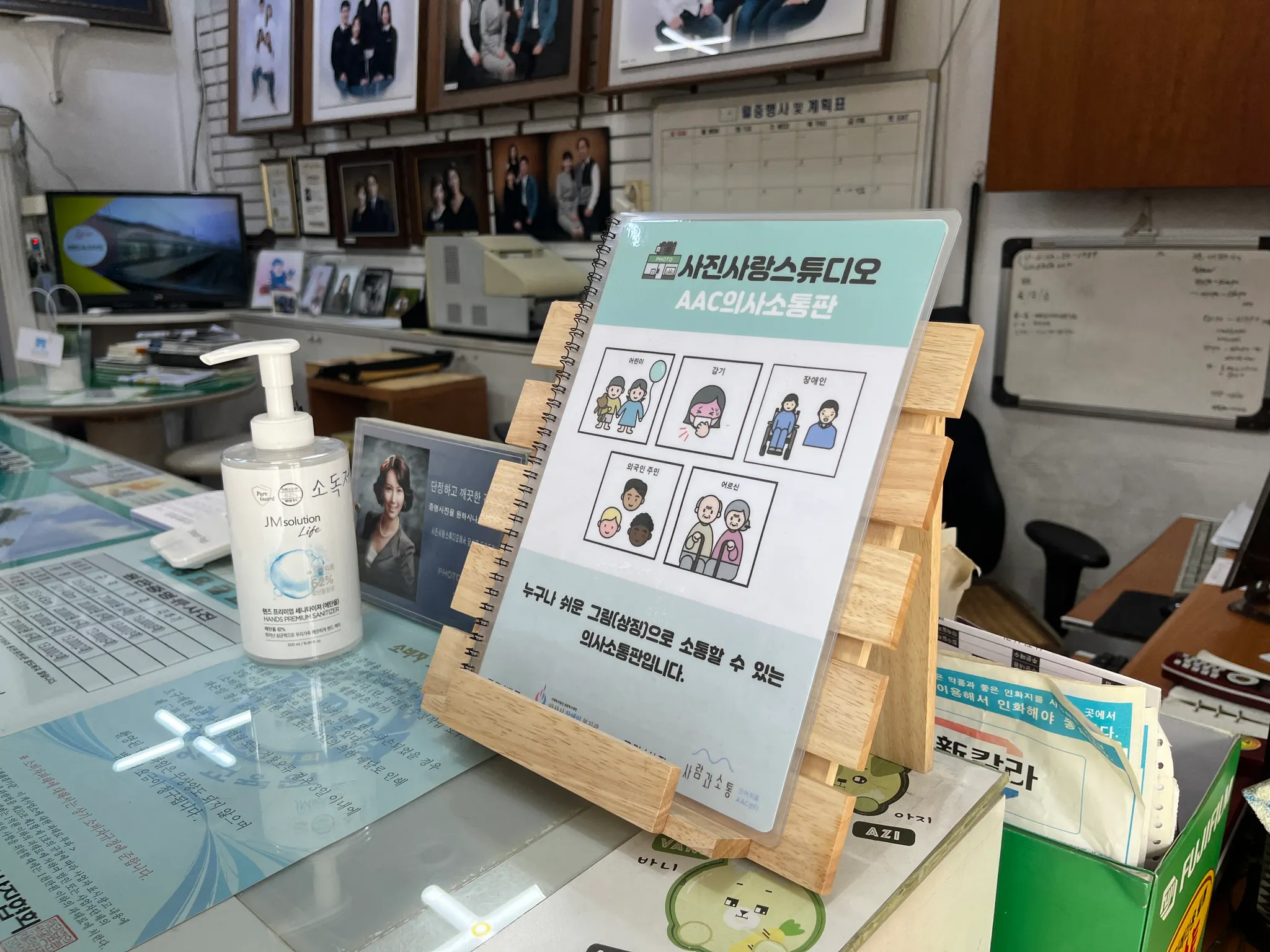 - 사진관 입구 카운터에 잘 보이도록 의사소통판이 비치되어 있습니다.