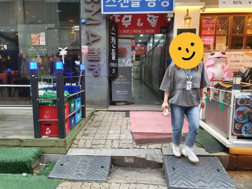 엘리베이터 탑승하는 곳까지 높은 턱이 있어, 휠체어 이용에 어려움이 있어보입니다.
