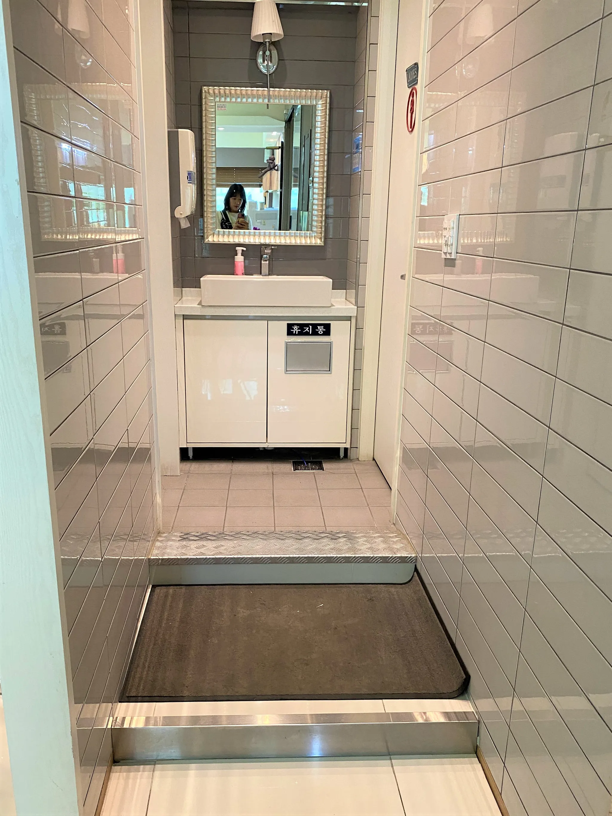 화장실 입구에 턱이 있고, 좁아서 휠체어 이용 시 불편 할 수 있습니다.