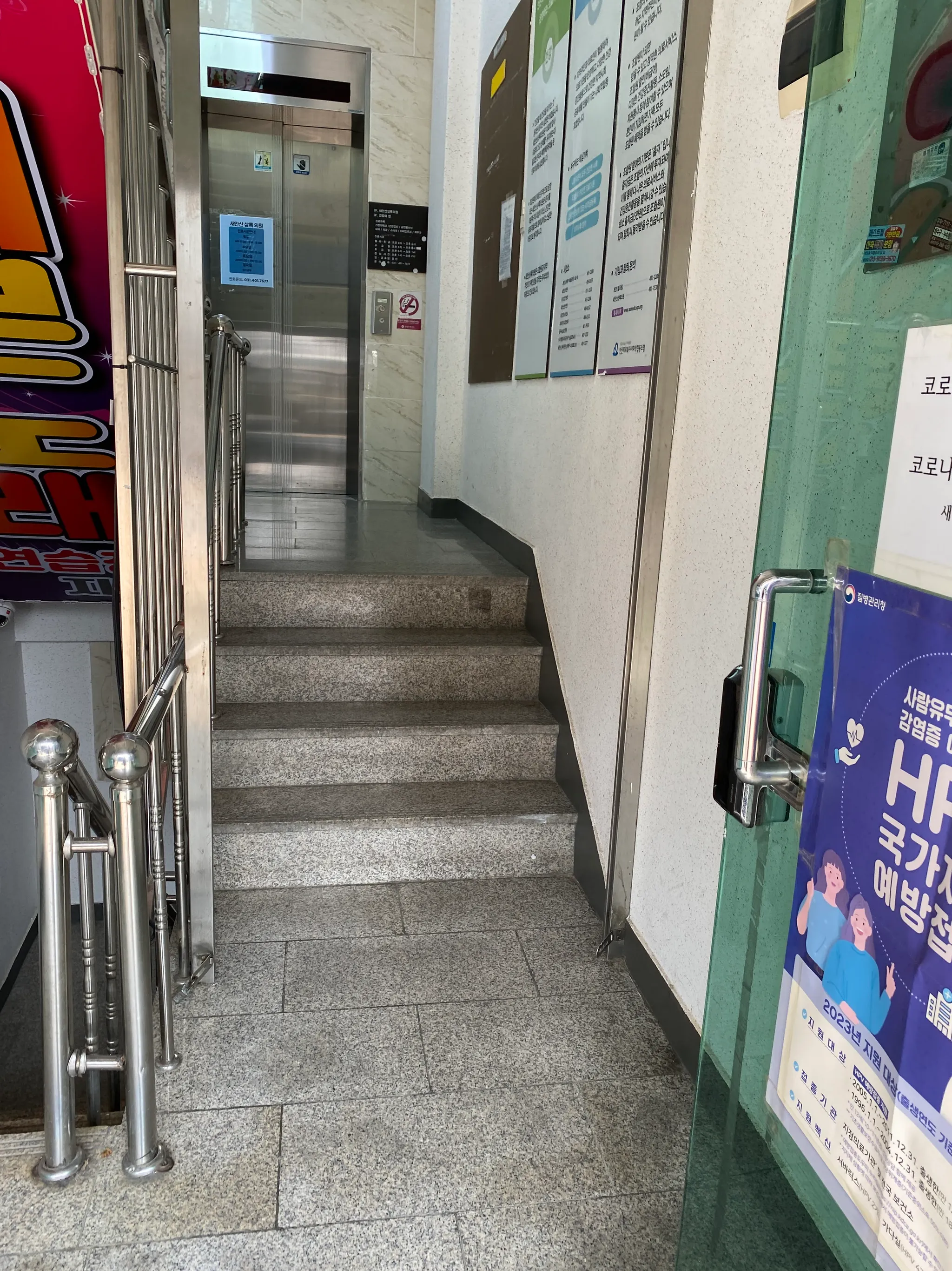 병원 건물 1층 입구에는 턱이 있습니다. 4 계단을 올라야 엘리베이터를 탈 수 있습니다.