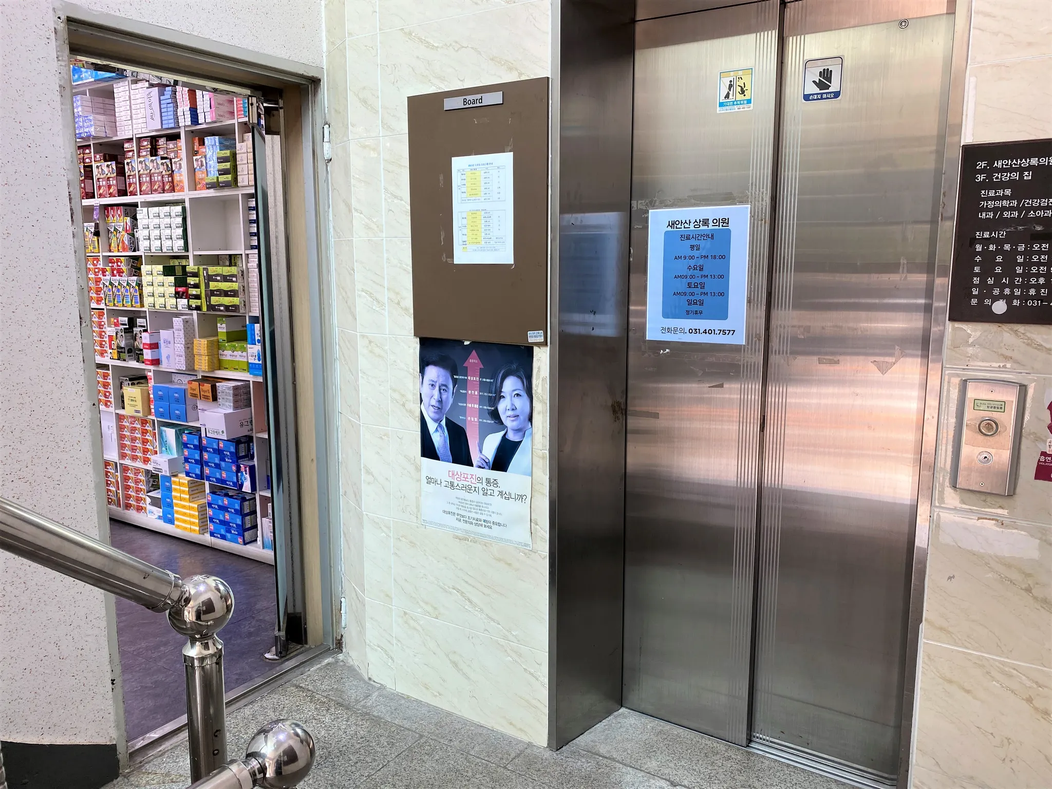 1층에 있는 백화점 약국 뒷 문과 엘리베이터 타는 곳이 연결 되어 있습니다. 휠체어나 유아차 등 이동이 불편한 주민은 약국에 양해를 구하고 약국 뒷 문으로 엘리베이터를 탑승할 수 있습니다.