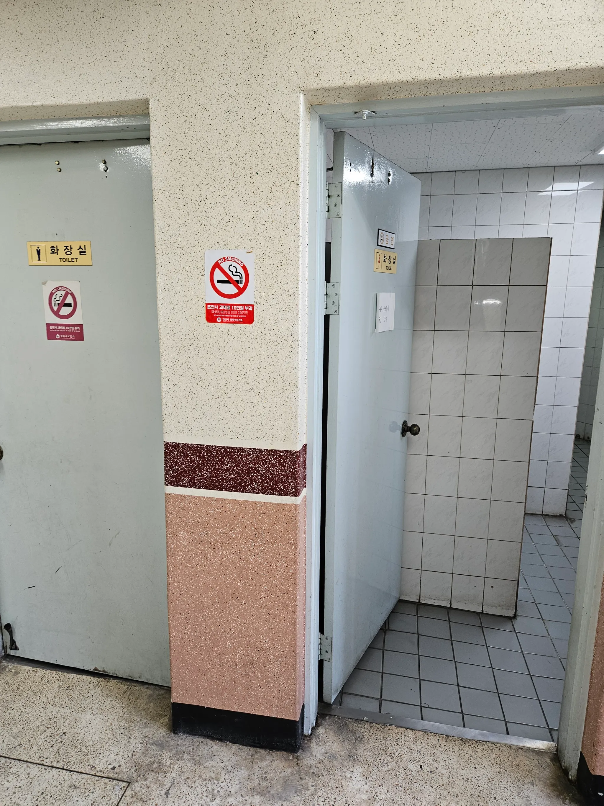화장실 입구에서 내부로 들어갈 때 내려가는 턱이 있으니 이용에 참고해주세요.