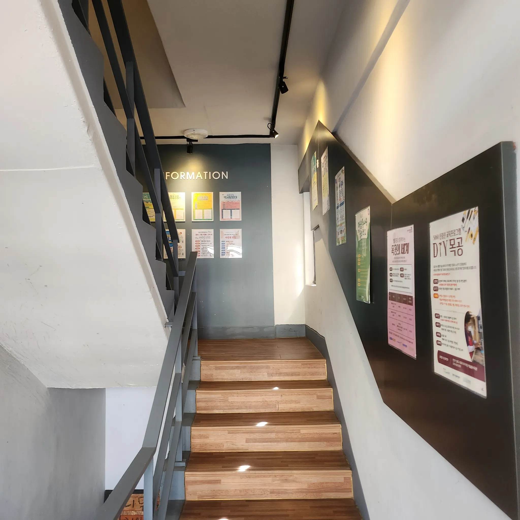2층에는 요리공간, 카페, 회의 공간이 마련되어 있고, 지하에는 목공방이 있습니다.