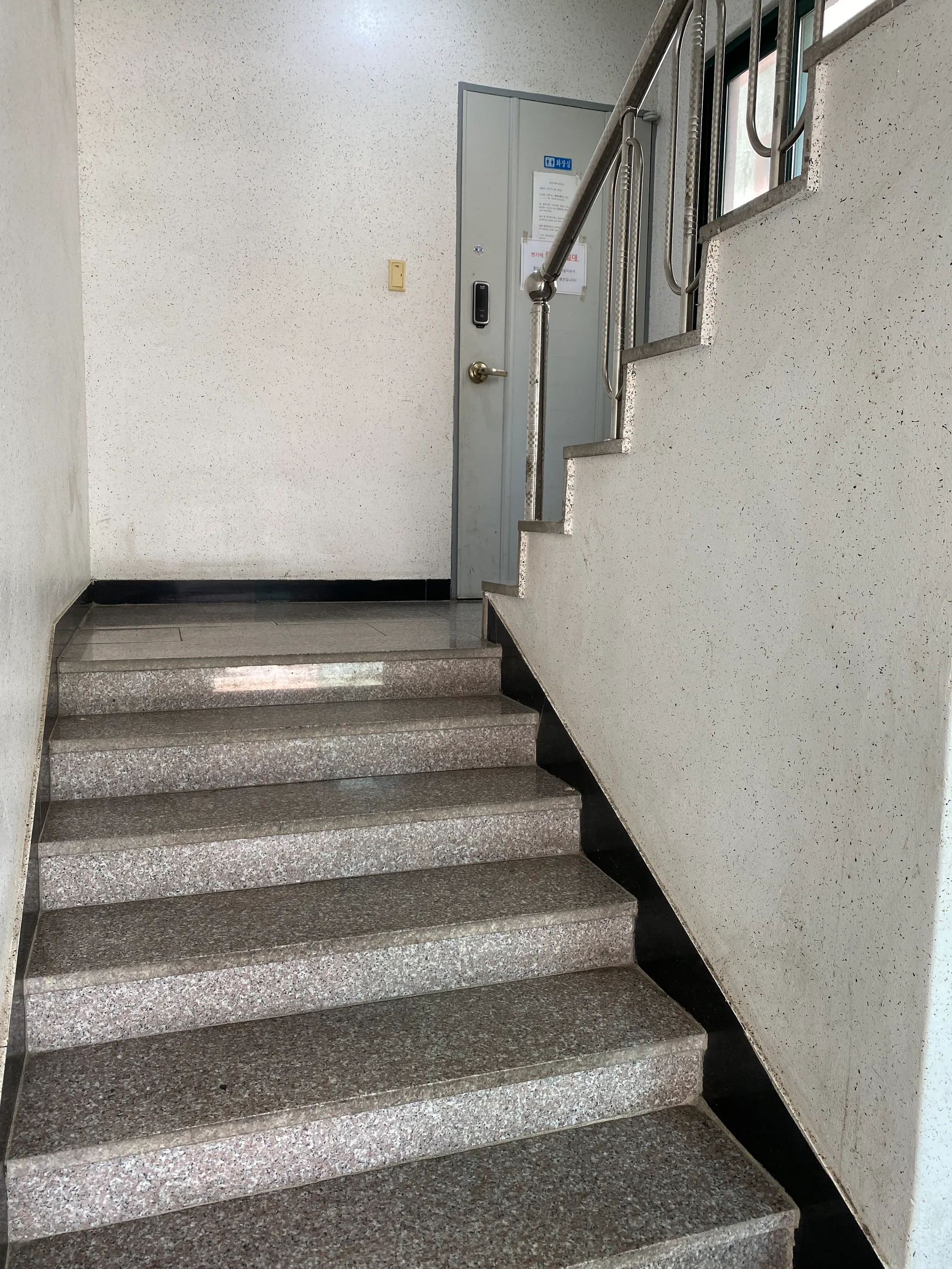 카페 왼쪽 건물 입구로 들어가서 7 계단 올라가면 화장실을 이용할 수 있습니다.