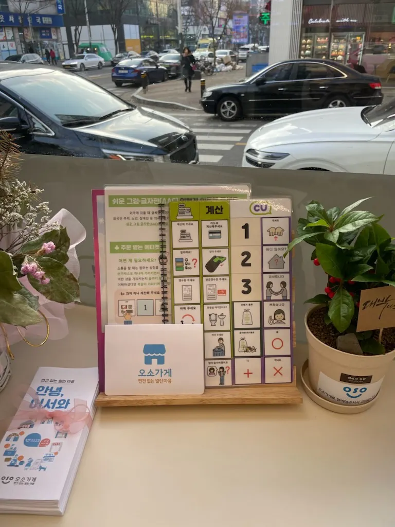 - 정문으로 들어와 왼쪽 테이블에 의사소통판이 비치되어 있습니다.