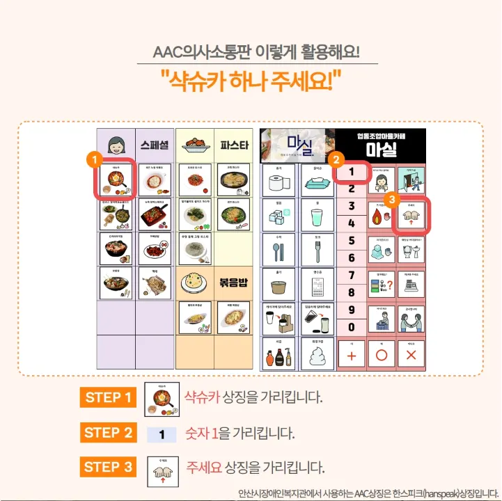 참고: AAC 제작 과정은 상점과 논의 후 진행됩니다. 빠른 제작을 원하시는 상점은 안산시장애인복지관으로 문의해주세요.